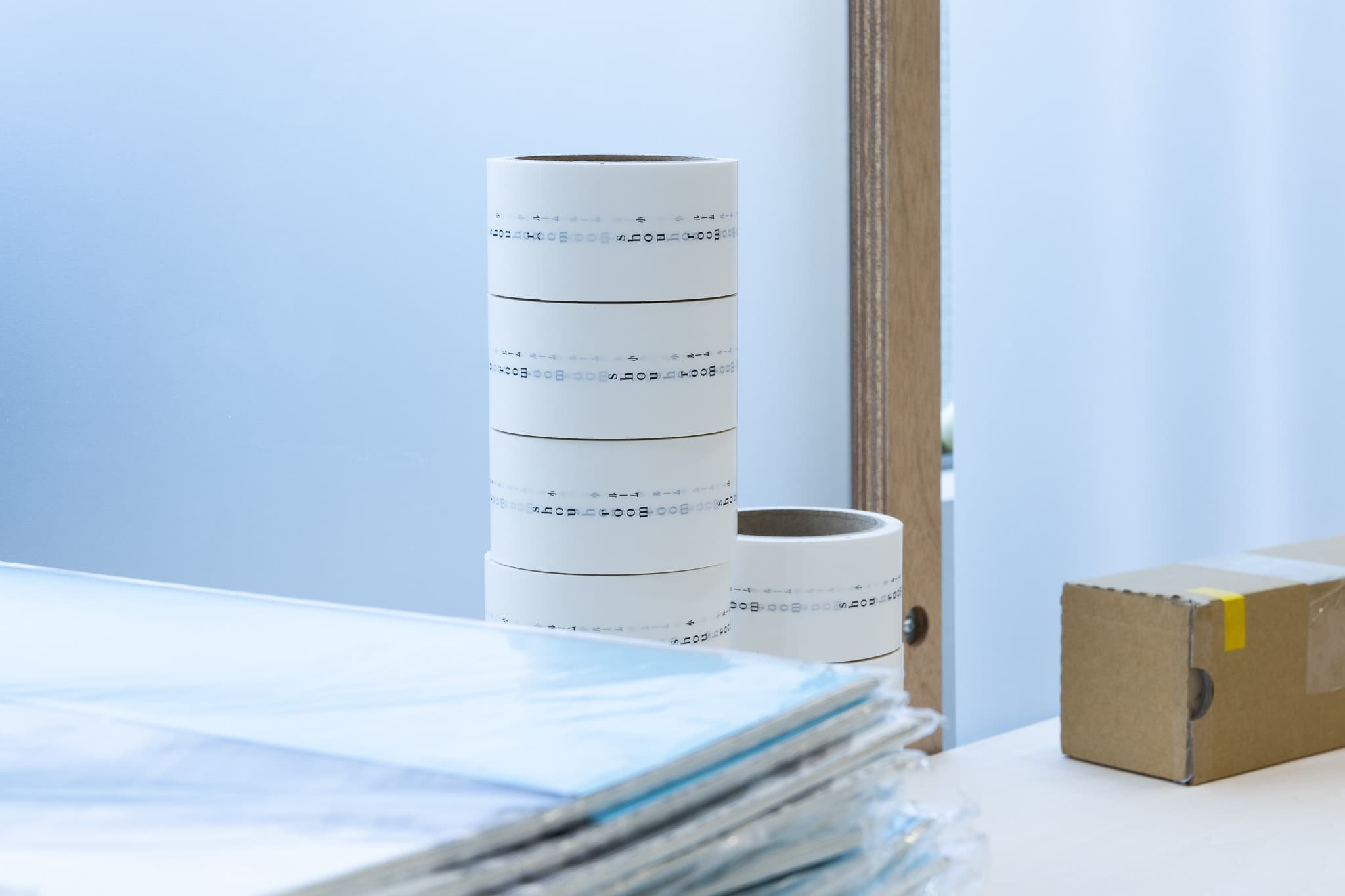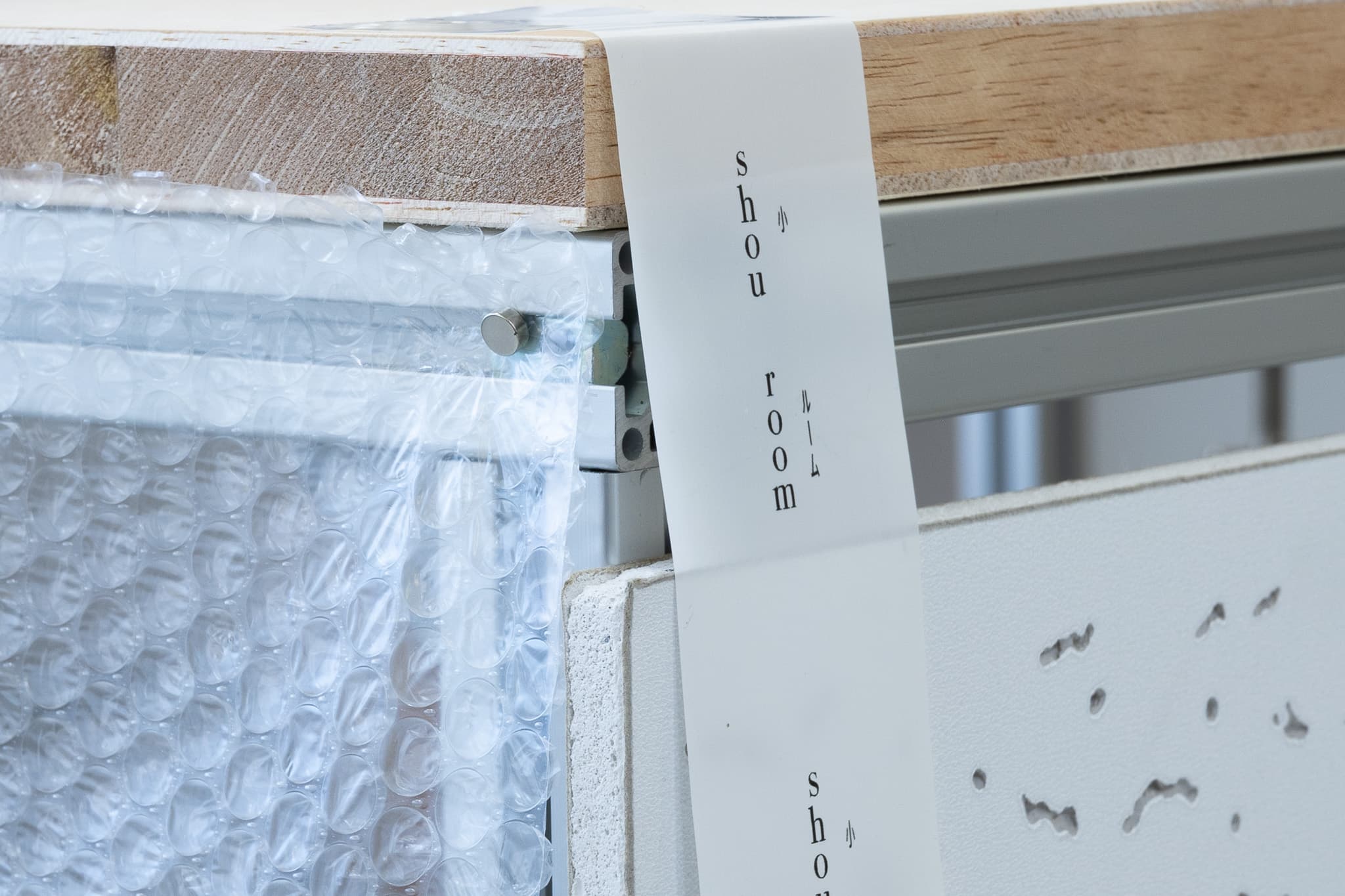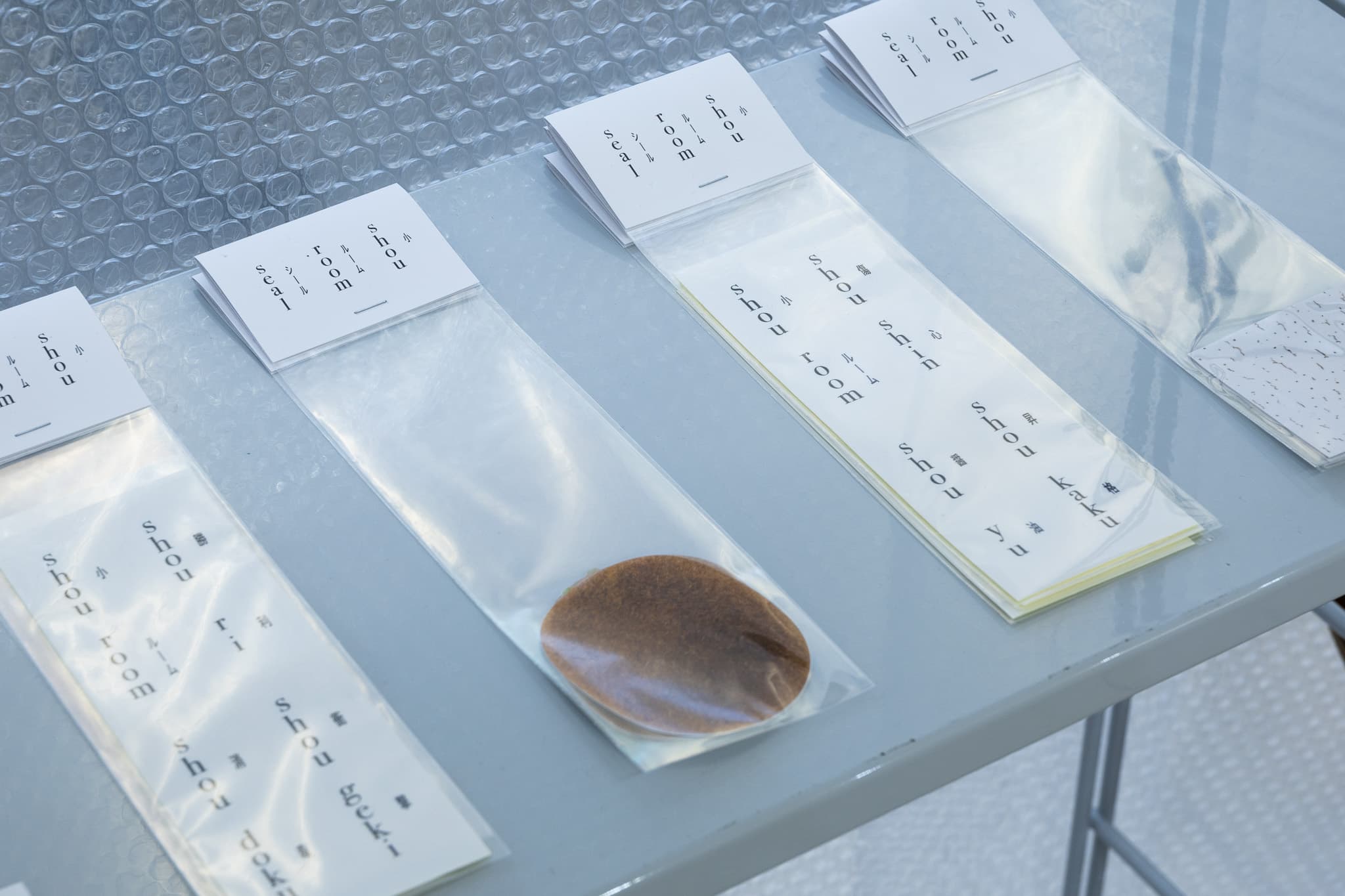 空間自体はSUNAKIのオフィスを間借りする形で展開されているため、住所とSUNAKIのロゴを繋げて表記することで両者の関係性を表した。書体もそのままSUNAKIのロゴタイプを流用することで、シームレスにSUNAKIとshouroomの関係性を繋がるようにした。一見するとごく普通の文字や意味の羅列だが、ギャラリーショップ空間と同様に、少しの違和感から生まれた創造性を感じさせられるようなロゴタイプを目指した。