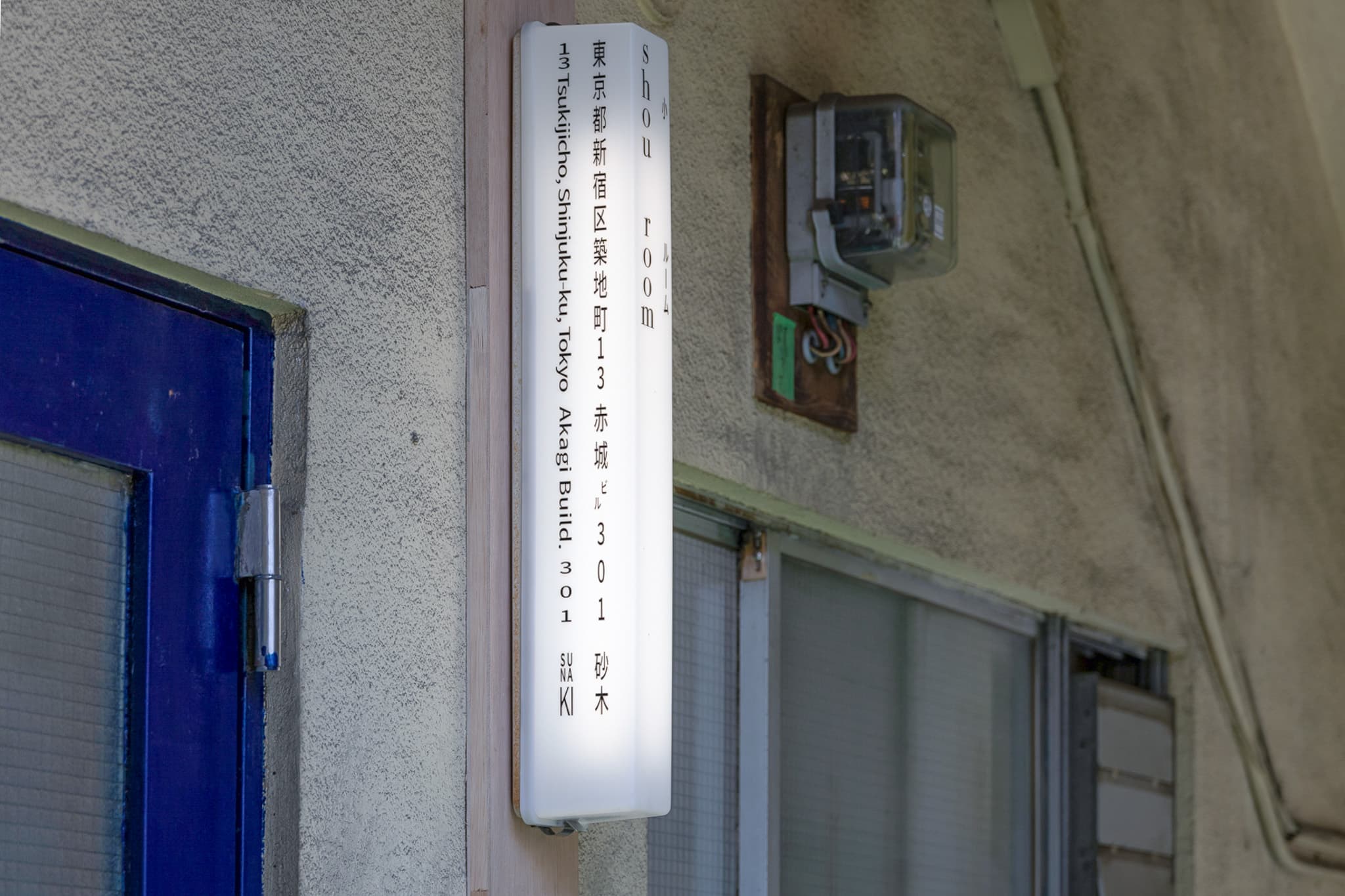 空間自体はSUNAKIのオフィスを間借りする形で展開されているため、住所とSUNAKIのロゴを繋げて表記することで両者の関係性を表した。書体もそのままSUNAKIのロゴタイプを流用することで、シームレスにSUNAKIとshouroomの関係性を繋がるようにした。一見するとごく普通の文字や意味の羅列だが、ギャラリーショップ空間と同様に、少しの違和感から生まれた創造性を感じさせられるようなロゴタイプを目指した。